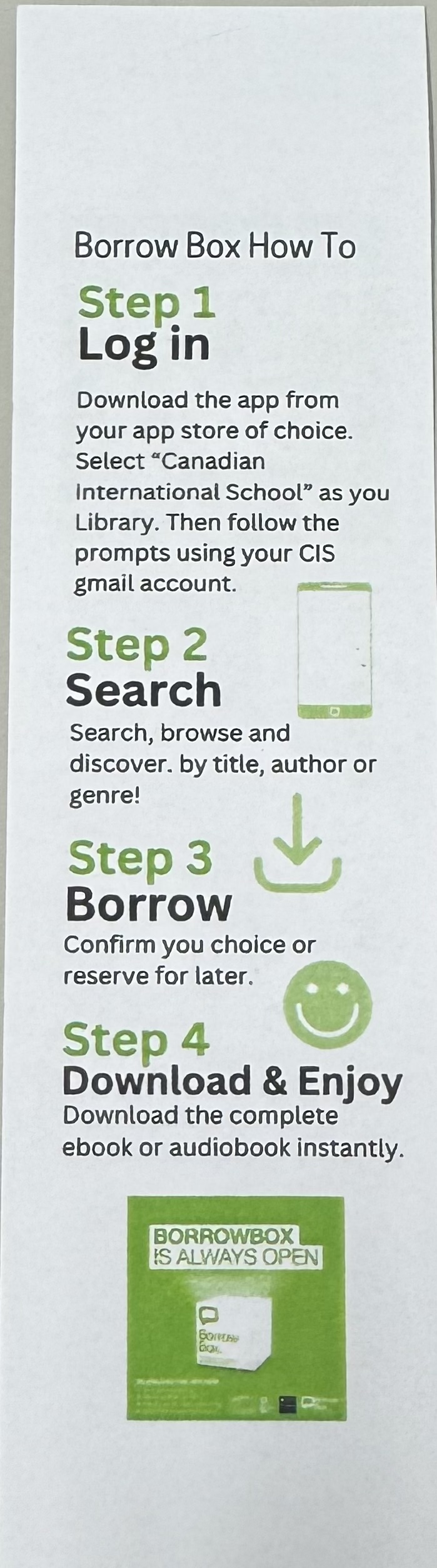 1. LOG IN: Download the app from your app store. Select "Canadian International School" as your Library.